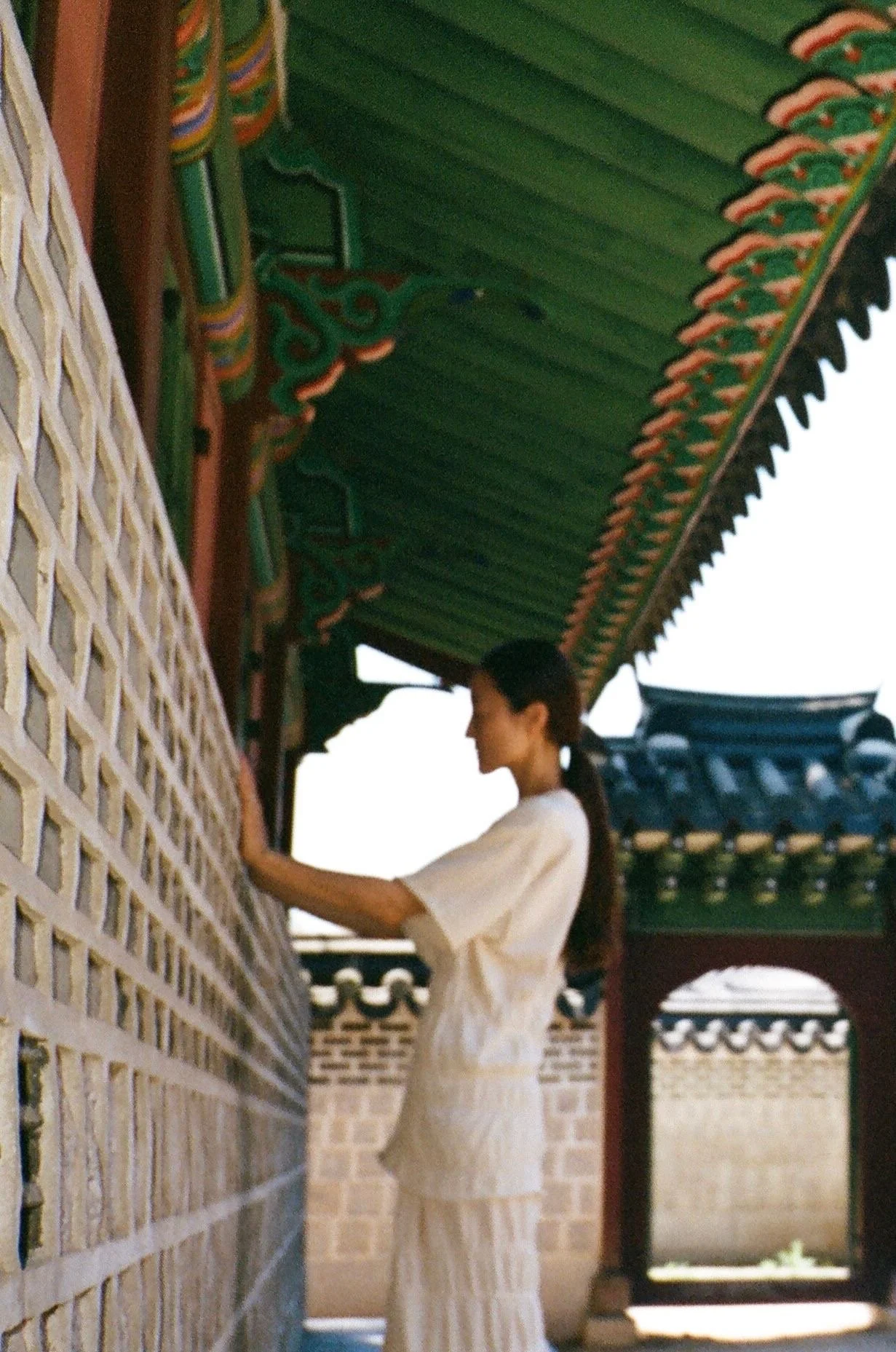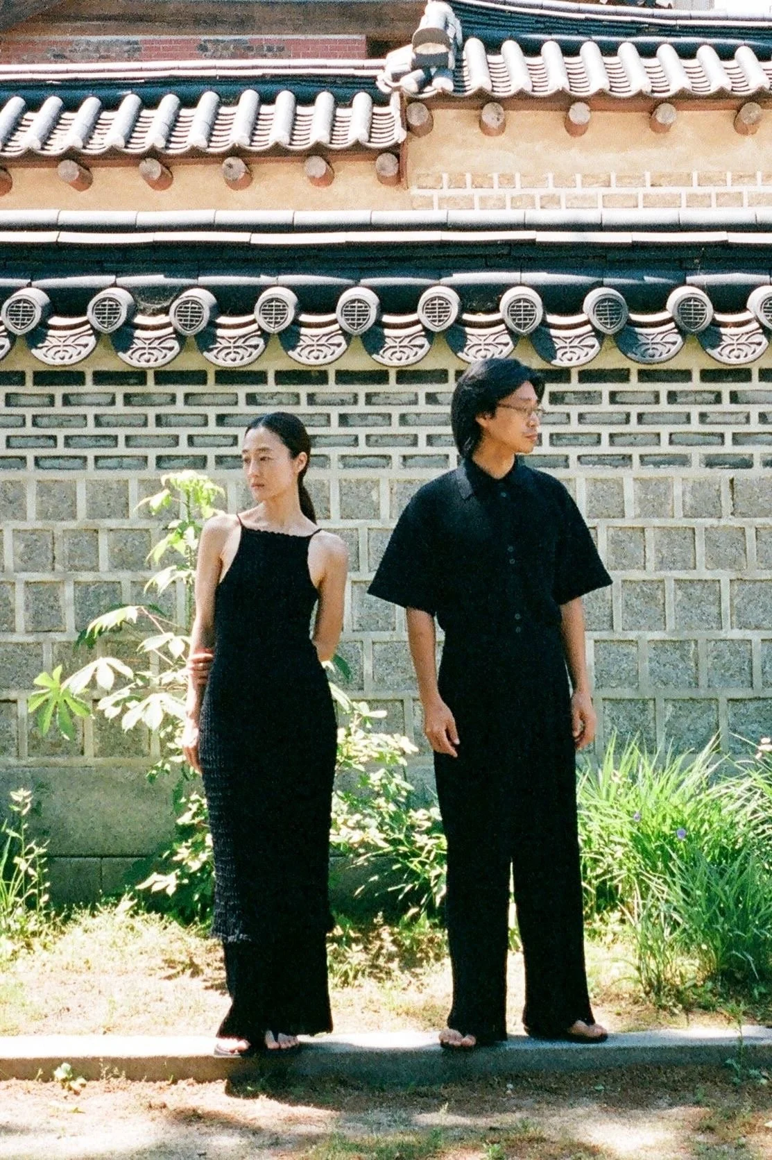 Moa wears the RINA dress and HASAMI pants. Namhoon wears the RAVIOLI shirt and HASAMI pants.