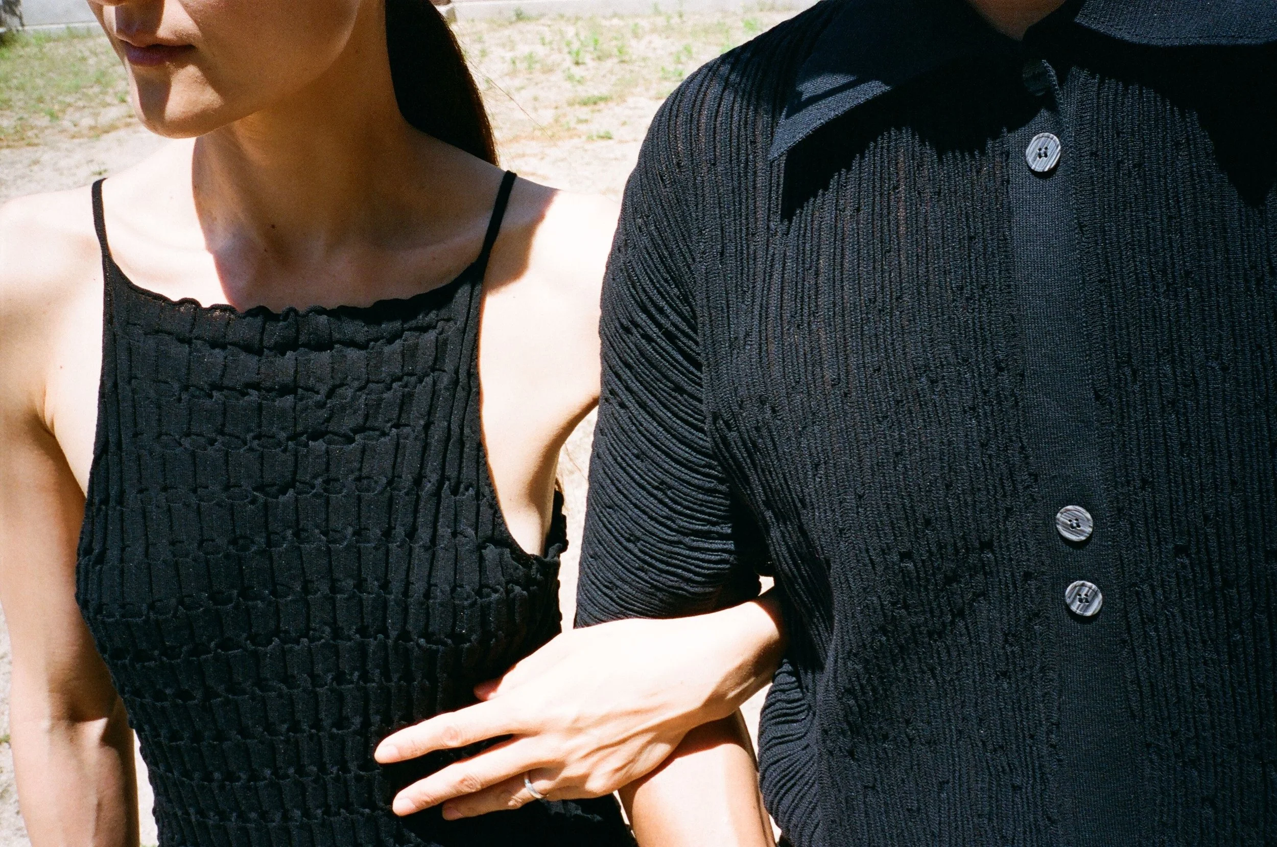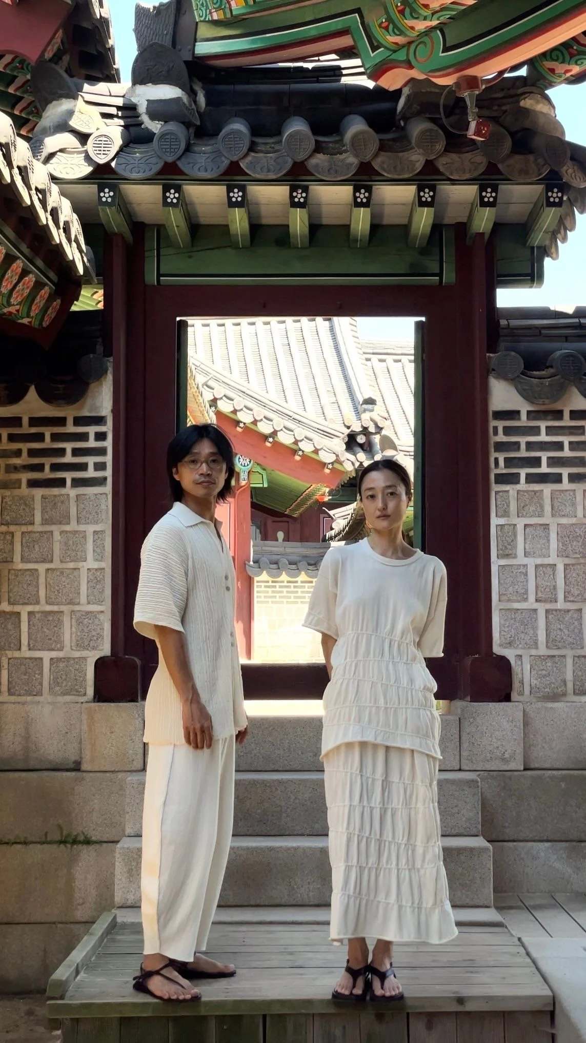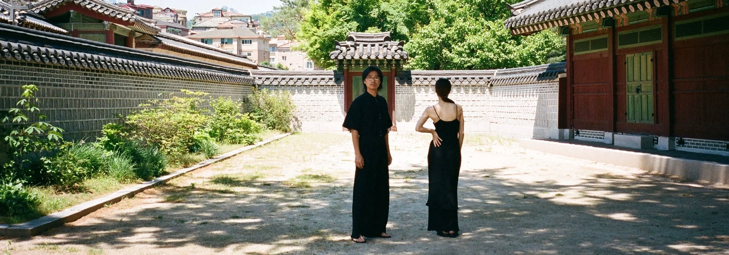 Namhoon wears the RAVIOLI shirt and HASAMI pants. Moa wears the RINA dress and HASAMI pants.