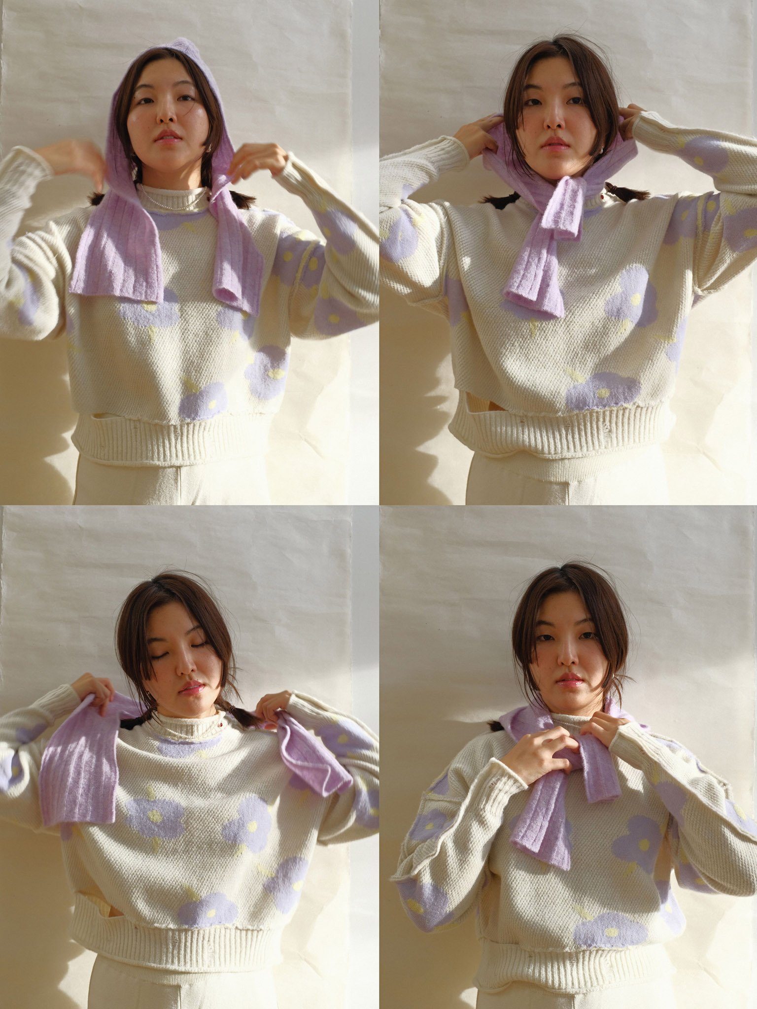SURO socks in butter, MIMI hood in Lavender and OKITA sweater in Chalk as seen by Sebit Min.