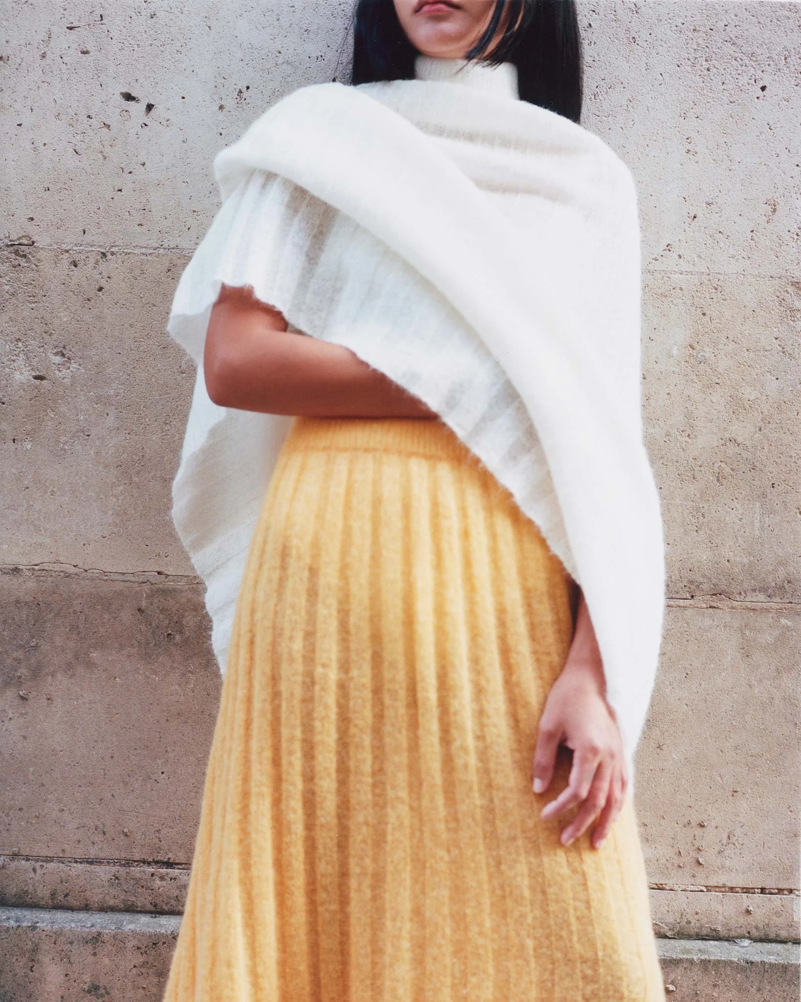 SUISEI scarf and Wakusei sweater and FOMO skirt in Chalk.