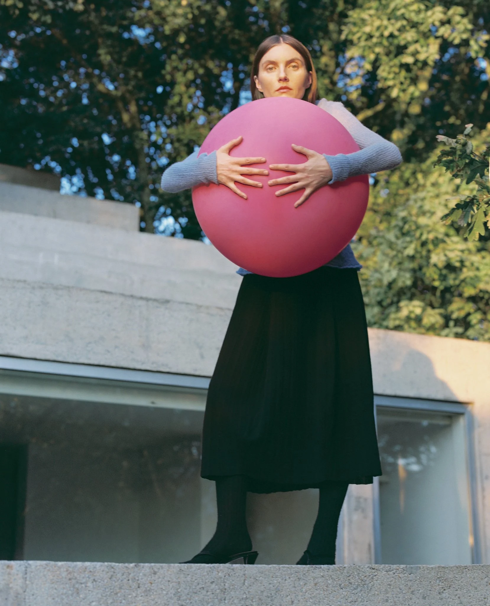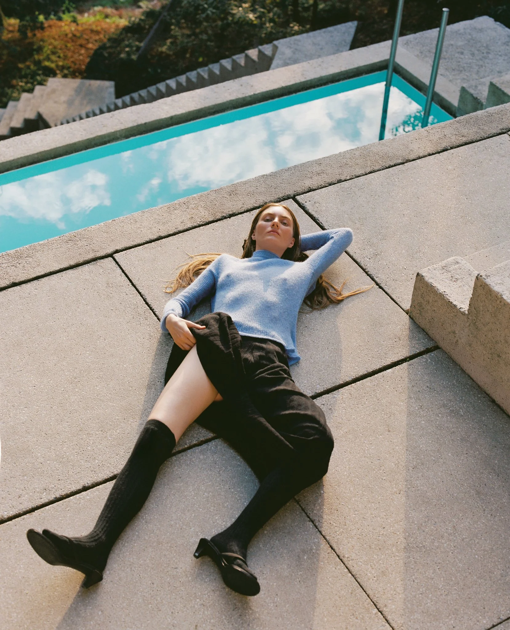 The contrast of brutalist concrete, soft grey tones, and the sky blue pool became a living backdrop for garments by RUS, whose minimalist designs and delicate textures seemed to echo the spirit of the architecture. Surrounded by nature, with the rustle of leaves in the wind, the warm glow of the evening sun, and the sense of being far from cities and stress, the process felt calm and immersive.